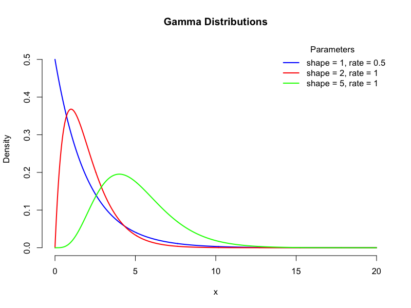 $$f(x;k,\lambda) = \frac{\lambda^k}{\Gamma(k)}x^{k-1}e^{-\lambda x}$$