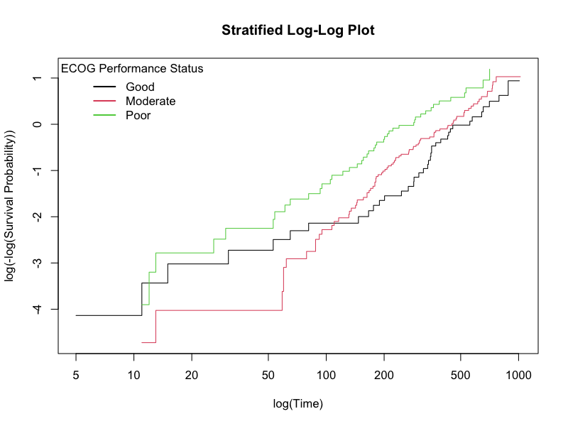 カテゴリカルな共変量を持つモデルに対して、各カテゴリの累積ハザード関数をログスケールでプロットし、その平行性を確認する視覚的診断手法です。